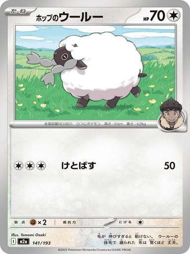 収録:MEGAドリームex コレクションナンバー:141/193 種類:ポケモン タイプ:無 カード名:ホップのウールー レアリティ:-